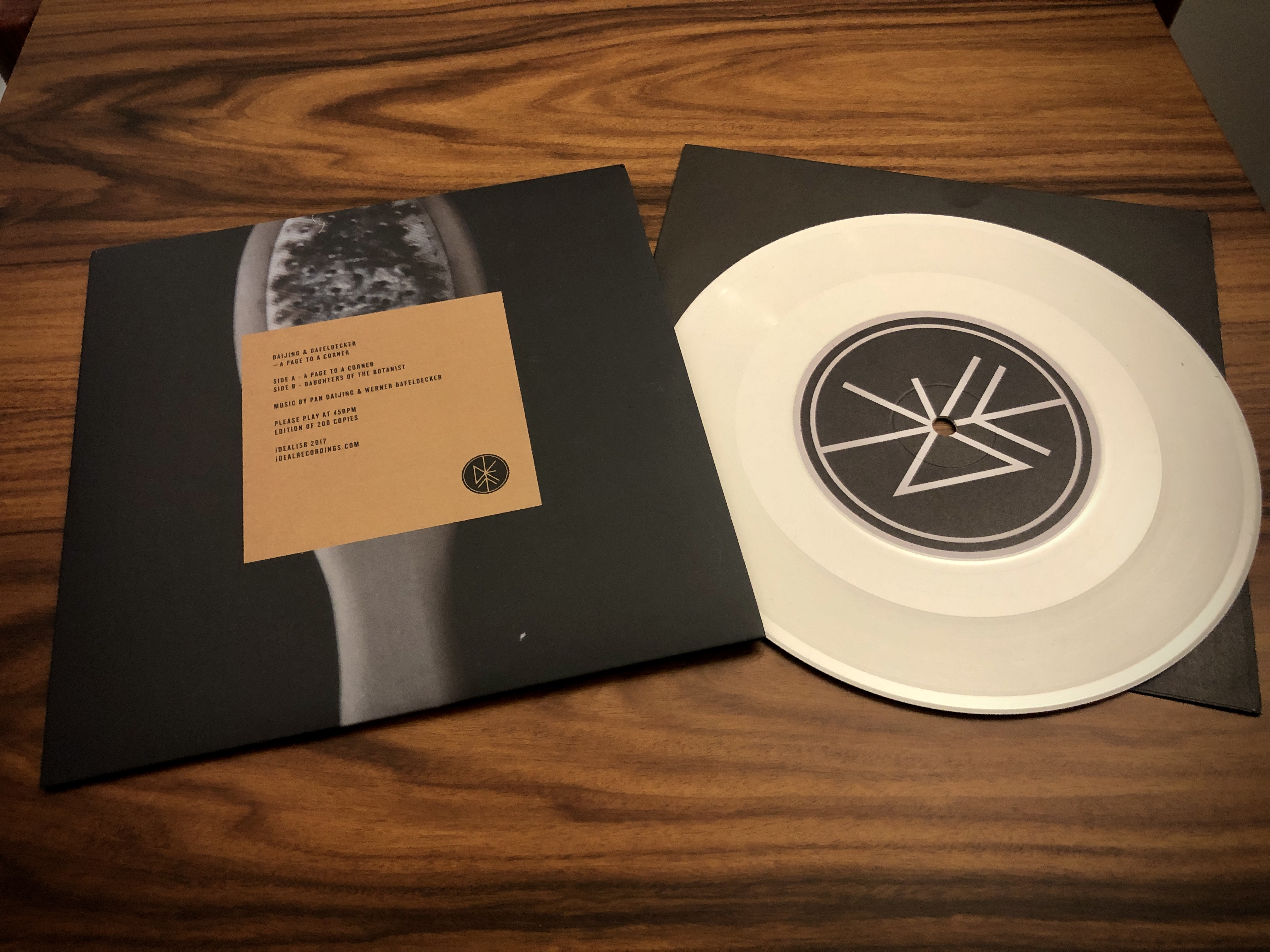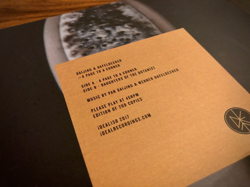Picked up a cool 7″ from Pan Daijing. A Page To A Corner sees her join forces with Werner Dafeldecker to create two pieces of evocative, richly dynamic sound art. There is a sense of creeping, murky unease to both the title track and B-side ‘Daughters Of The Botanist’, with the latter a particularly brooding enmeshing of croaked vocals and droning gong-like sounds. Limited to 200 copies on cool white vinyl.