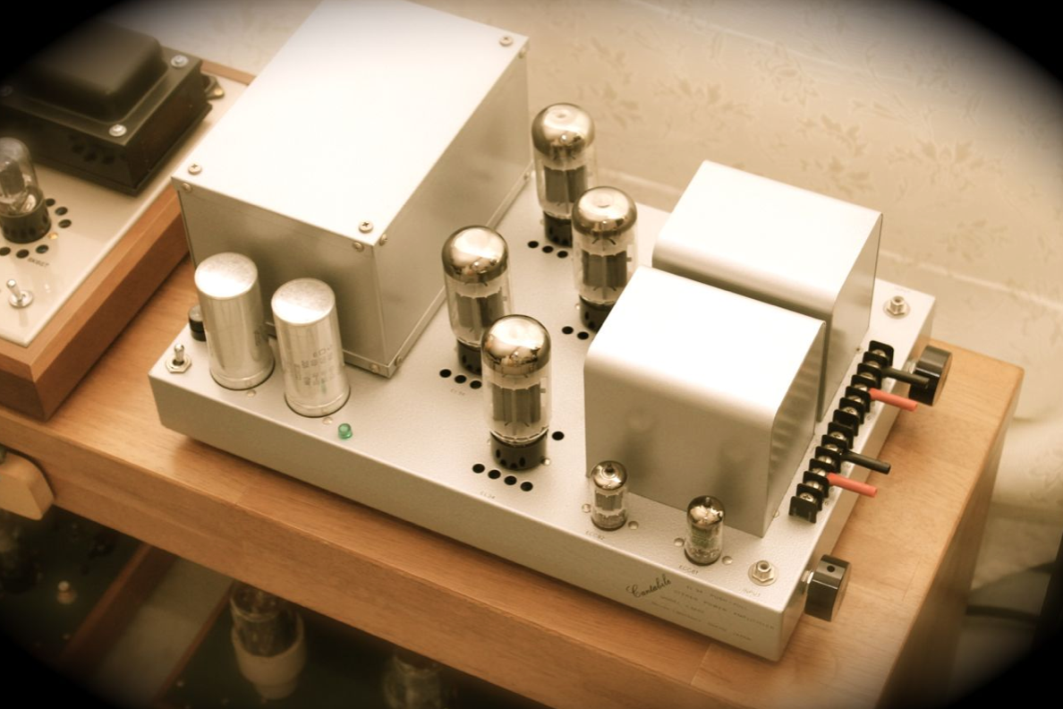 An early Ken Shindo work, not yet painted green. But back to Ken Shindo and his Cantabile, which, in contrast to the Shindo amplifiers later exclusively painted green, still came in a silver colour similar to a hammer blow. The Cantabile is a push-pull power amp design featuring the EL34 that was released sometime between 1982 and 1985.