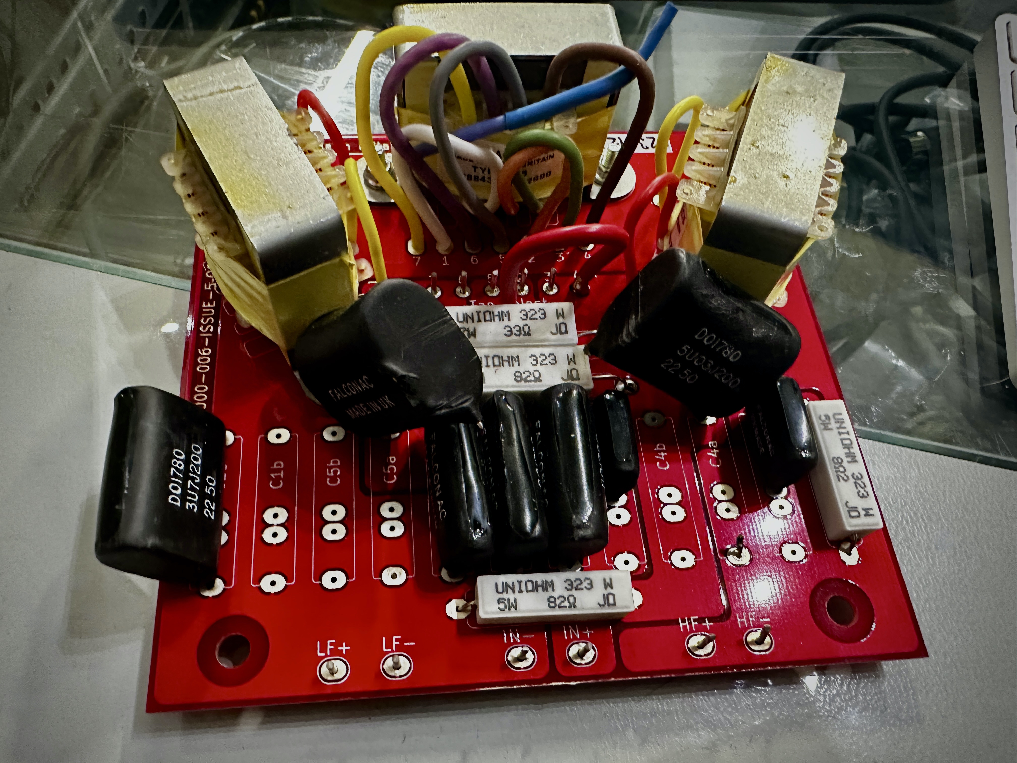 The Goldbadge crossovers also arrived, but one was unfortunately damaged in transit as you can see in the photo. A couple of the bigger capacitors broke from their moorings… Jerry at Falcon is sending me some replacement caps to solder in. Not a biggie, but a bit annoying.