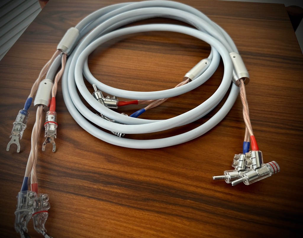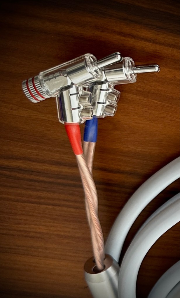 I bought some copies of WBT angled spades and locking banana plugs to terminate it with, and also some nice splitters to make it look a bit more slick. I did use proper crimp sleeves on the cable and used clear heat shrink to bundle the conductors to make it tidy. Looks pretty good I reckon. A bit more bling than I am used to.