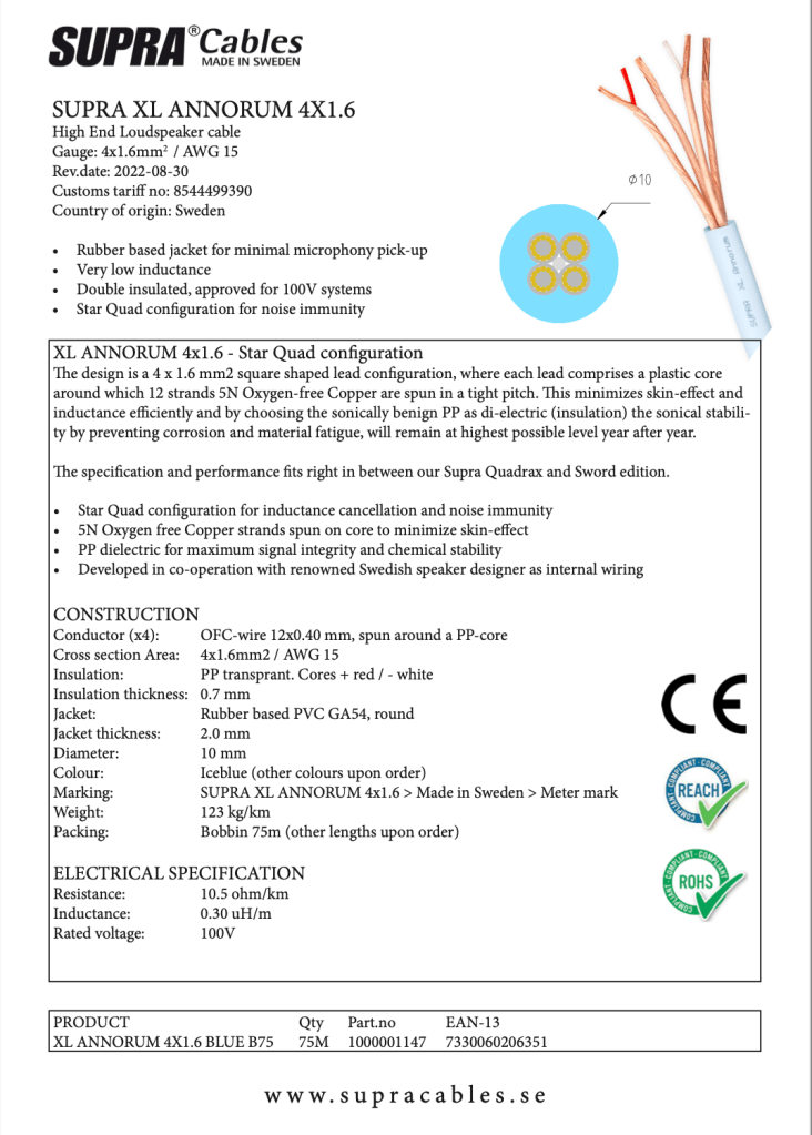 According to to the blurb: ‘Supra XL Annorum is a speaker cable we are proud to announce as one of our 40TH Anniversary offer. The name derives from playing with latin numbers and language where XL means -10+50=40 and Annorum is a bent form of Anno, latin for year, hence 40 Years. We take great pleasure in the fact that this cable is developed together with a reknowned Swedish speaker designer famous for e.g. QLN speakers among others. The intention was a conductor lead for the internal wiring of drivers and cross-over filter. During the progress we acknowledged such good performance that the idea of having the conductors forming a complete speaker cable came to life.