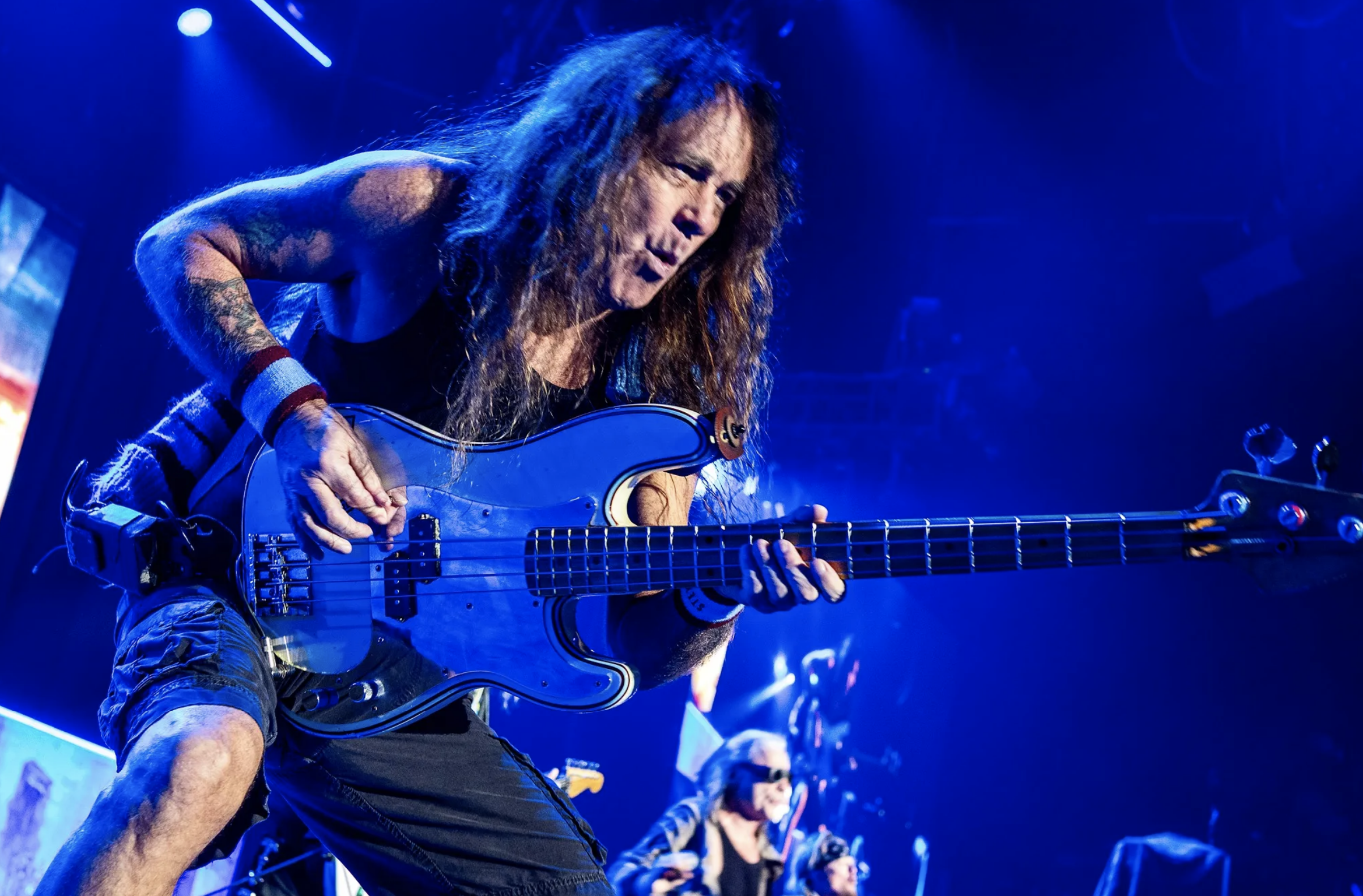 Dickinson had once again changed his top, the rest of the band remaining in their homage to the traditional metal look of long hair and black jeans as the band once again went back in time for ‘Alexander the Great’, Dickinson looking like the cat who got the cream as he ran to the top of the riser above McBrain, leaned over the edge and banged the gong with relish, his mischievous smile as he did once again reminding all of just how much he loves what he does. He ended the song by holding the last note perfectly for an incredible amount of time, so long that it made some fans down front stop for a moment and stare at him in reverence.