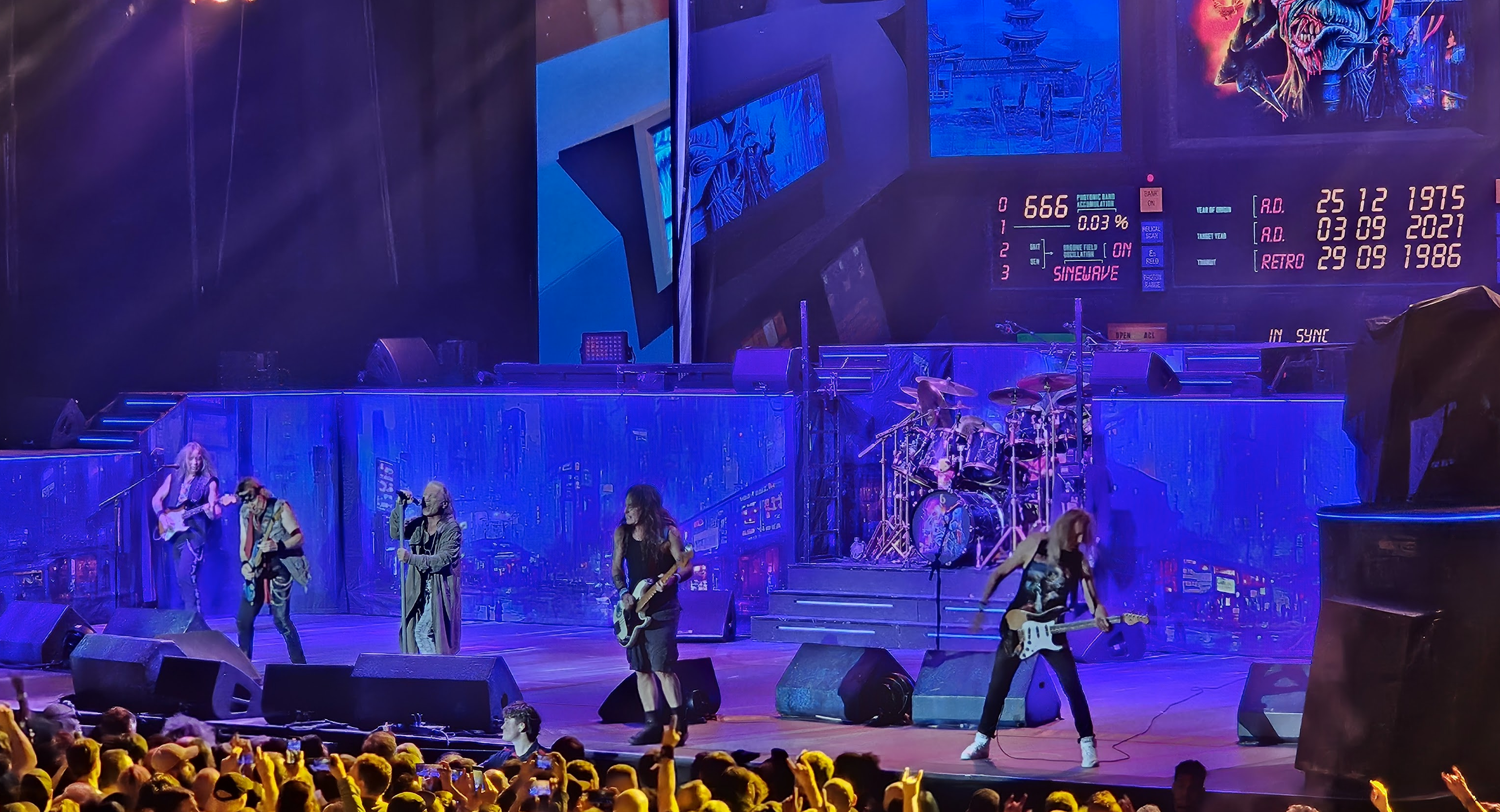 ‘Changeover occurred swiftly, thousands of eyes glued to the stage as roadies and techs bustled about under a cover of darkness. The intro music of UFO’s ‘Doctor Doctor’ and Vangelis’ ‘Blade Runner’ theme set the tone, 80’s style animation of their beloved mascot Eddie coming into view on screen before a loud bang announced the arrival of the band as they sprung into view, Bruce Dickinson running out with arms outstretched. Straight into ‘Caught Somewhere in Time’ and ‘Stranger in a Strange Land’ from the 1986 album Somewhere in Time, the duo of songs immediately had their fans hanging on their every move.