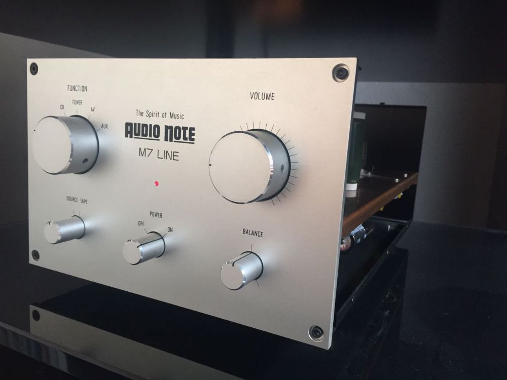 The first product of Audio Note Japan was a preamplifier in which I used high-voltage field-effect transistors developed by Mr. Shigeru Terada with the assistance of Shindengen. It should be recalled that at first, field-effect transistors were used, like vacuum tubes, as voltage-amplifying elements. But the high level of distortion did not allow their use in amplifiers claiming high quality. Field-effect transistors used instead of vacuum tubes had a volt-ampere characteristic that was unusual for semiconductors and generously generated the second harmonic. In addition, their use was complicated by the low voltage, about 50 volts, for which they were designed. But then Mr. Terada developed a field-effect transistor that could withstand 200 volts. This phenomenal improvement greatly simplified the design of amplifiers and significantly expanded the range of application in circuits with low distortion. I designed a preamplifier using such field-effect transistors, which became the prototype of the Meister-7 model, abbreviated M-7. The case was quite large, in its upper part there were oil and electrolytic capacitors of the power supply. Later I made a more compact M-7II, in which I used a cascode circuit for the amplifier stage. The advantage of such a circuit was that it significantly reduced leakage current and distortion at the same time. At that time I also used interstage capacitors with oil-impregnated paper. After the cessation of production of field-effect transistors developed by Mr. Terada, I stopped assembling the M-7. Only 100 preamplifiers of this model were produced. I heard that some copies still work and are highly valued.