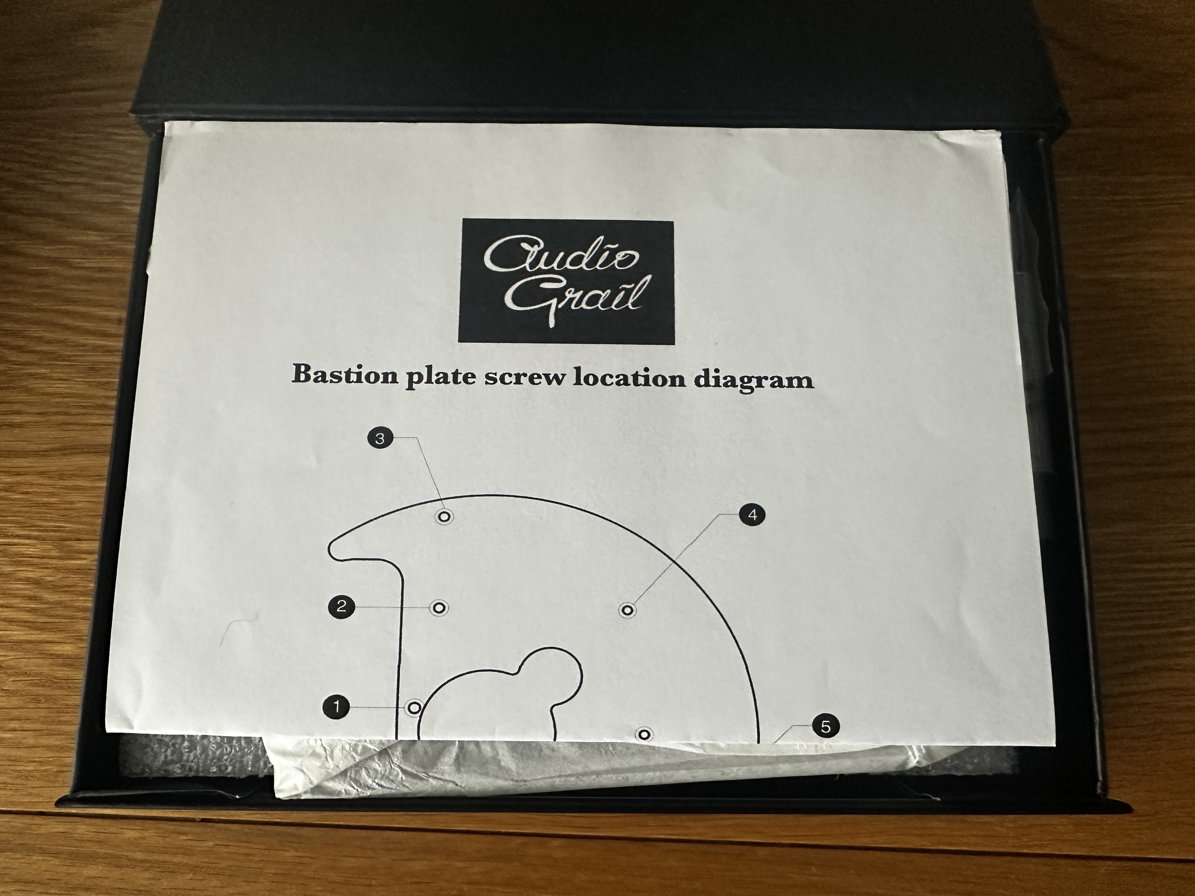 Here’s the blurb: “The Audio Grail ‘Bastion Plate’ is a hand layered high graphite content 3K 5mm thick carbon fibre form designed to stiffen the top of the 301 chassis. (Carbon Fibre is up to x6 times stiffer than aluminium.) A little history… The 301 was designed in 53 and released in 54 three years prior to the advent of Stereo. Garrard had to to play catch up with the demands of Stereo transcription throughout the 301’s production. These adaptations ultimately culminated in the 401 featuring a considerably stiffer ribbed chassis with bridge over the motor cut out. Enough of the history, what are the benefits? Detail from low to high frequency, increased separation and enhanced imaging. There’s more… An additional benefit of this UK produced carbon fibre is its graphite content which manages resonance extremely well (Graphite dissipates resonance quickly) The Bastion plate comes with slightly longer screws and mounts to the existing holes in the chassis – No drilling or bonding, the authenticity of the unit is preserved – This upgrade is of course completely reversible – we think it looks great too!”