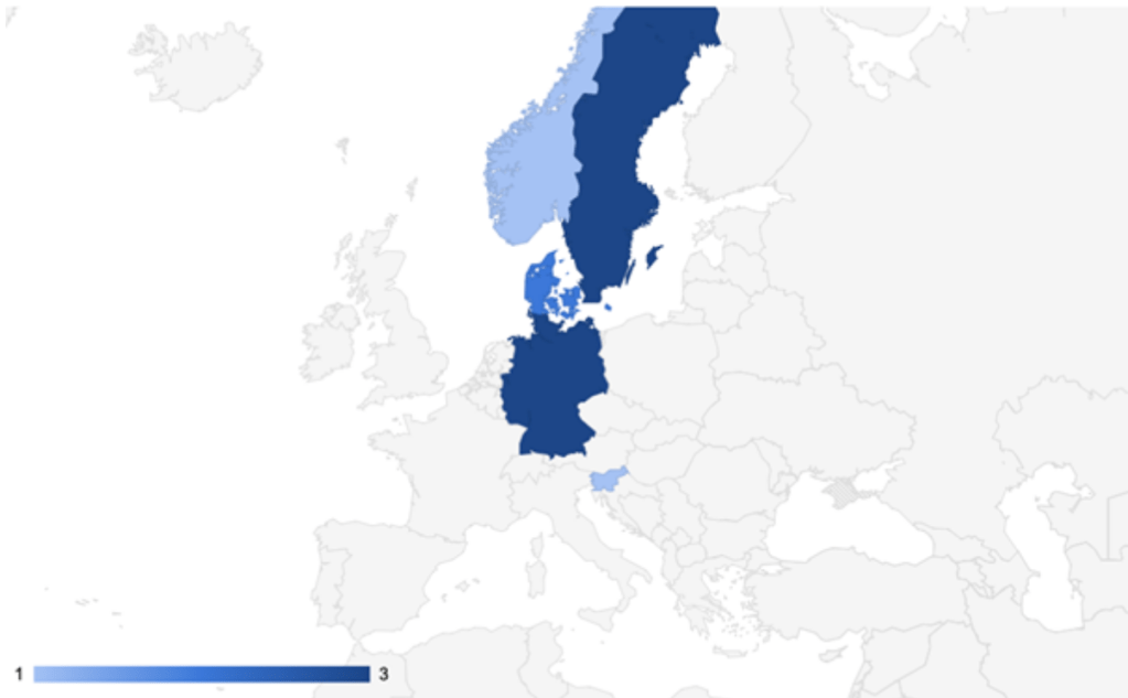 Table 1 also indicates that texts were discovered in five different countries. Figure 1 shows where inscriptions were found that were used in “In Maidjan.” As can be seen in this figure, these countries are at the heart of the pre-Christian Germanic world.