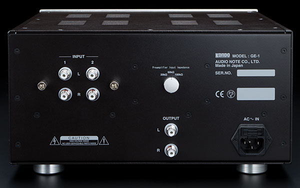The same construction quality, as well as the same silver wiring, handmade capacitors, bespoke resistors, copper ground plane, and tuned, multi-metal chassis, are seen in the Kondo GE-1, a moving-magnet (34dB of gain) phono preamplifier with separate, switchable input pairs for two phono pickups. The GE-1 uses three of the aforementioned Electro-Harmonix 6072 dual-triode tubes, which provide a two-stage, zero-feedback gain circuit and a cathode-follower final stage for low output impedance. At the other end of the GE-1, an input-impedance selector switch—with choices of 20, 50, and 100k ohms—offers the user a non–signal-degrading means of tailoring response in the face of turntable rumble or other system anomalies. The power supply of the GE-1 is built around an original Kondo cut-core transformer and a 6X4 rectifier tube, with a solid-state (TO3 transistor–based) supply for the heater circuits. The stock AC cord is Kondo’s ACc copper, which sells separately for $1150/1.75m.