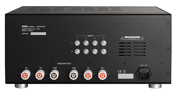 The 32Wpc Overture isn’t big on creature comforts, lacking a balance control, a mono switch, and, as one might guess from its pairing with the Kondo GE-1, a phono stage. But it does offer four pairs of line-level inputs—selectable by means of a rotary switch with an unusually solid feel—and a choice of 4 or 8 ohm output sockets. Notably, the Overture also offers freedom from that most needless of all extra-cost accessories, the remote control. The Overture comes standard with the company’s ACz Avocado silver AC cord, which sells separately for $2450.