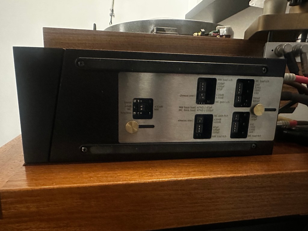 The bottom control panel is bordered by substantial rubber strips, with a slidable metal door secured by two large brass thumbscrews. Beneath this panel, five small windows hold multiple dip switch adjustments. Arranged in a mirrored left/right channel layout, one window provides access to a boost function (+0dB , +10dB ). MC can be set to +20 dB or +30 dB gain. The remaining switches handle loading: for MM, 47pF, 100pF, and 220pF; for MC, 1kΩ, 33Ω, 100Ω, and 330Ω, plus 330pF and 680pF. It’s extremely well-constructed, nicely adjustable, and intuitive once you spend a few minutes with it.