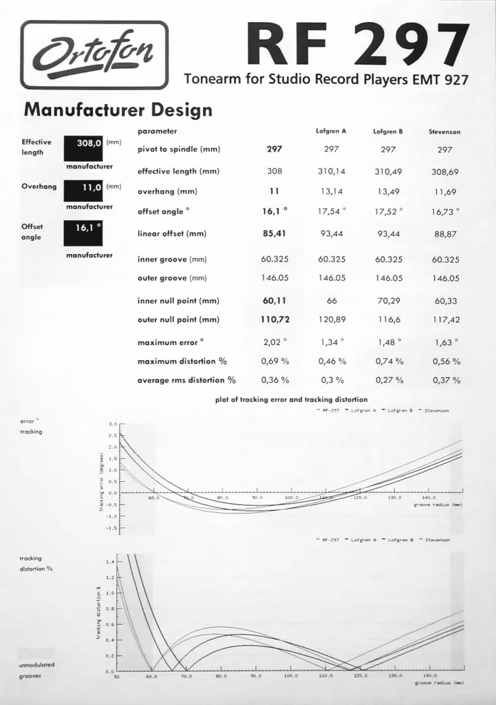 On a suitable turntable the RF-297 feels immovable. It was made for low compliance cartridges like the early SPU A and EMT types. The heavyish arm tube and large bearings give it real authority in the way it tracks the groove, the sort of confidence modern light arms rarely provide. The sound has weight and presence, with a midband that stands firm. Studio engineers valued this because it meant the cartridge behaved itself no matter what was happening around the console.