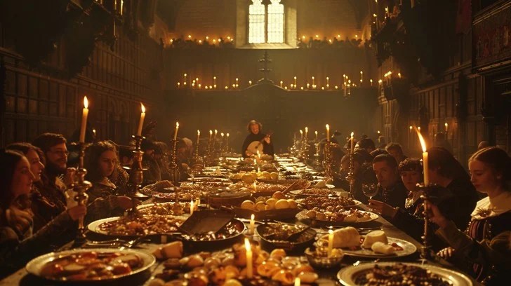 It feels like stone corridors, damp air, candle smoke, black fabric absorbing light, feasts, and stories.