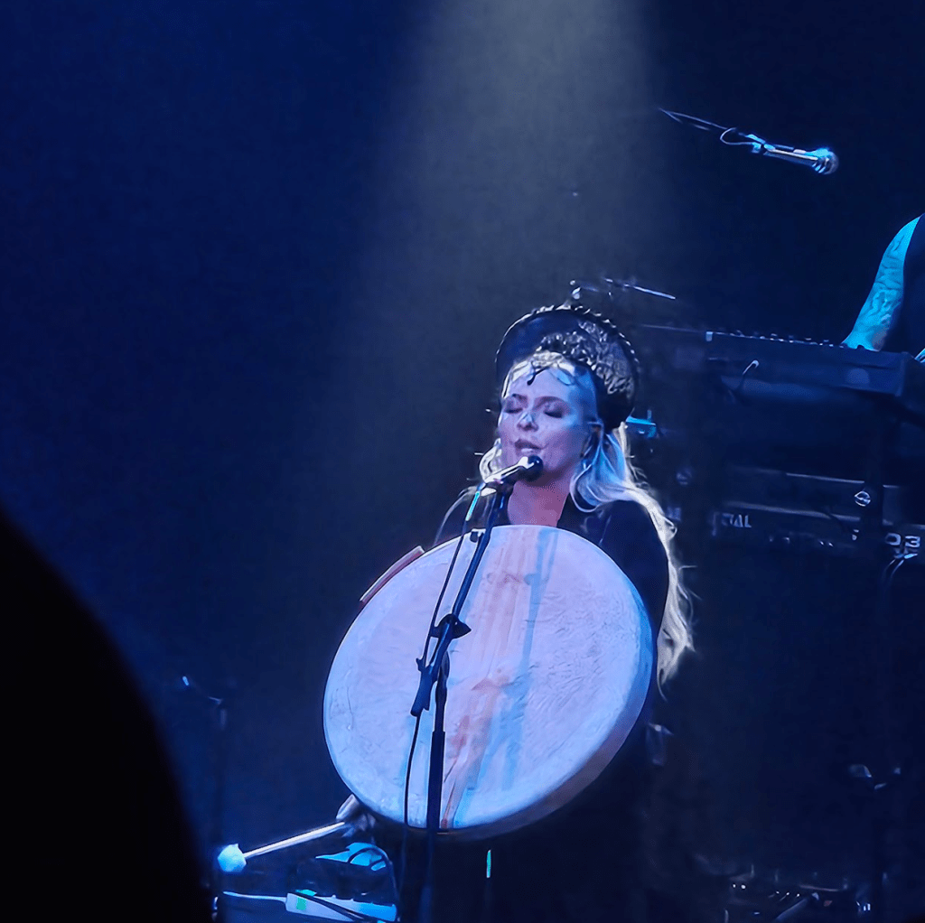 One of the most arresting passages came when she took up the Sámi drum. The atmosphere shifted instantly. Ancient pulse, insistent and hypnotic. The language itself seemed to change shape, moving between guttural incantation and soaring melody. It was atavistic, mesmerising, deeply physical. In contrast other moments leaned into piano and synth textures, tribal tom patterns anchoring electronic undercurrents. The sonic palette was vast but never cluttered. A careful architecture of tension and release.