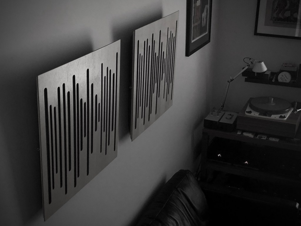 I have a few acoustic treatments in the room, nothing too much, but I do have some Vicoustic DC-2 diffusors on the ceiling and intend to add a few more when I can. Latest addition is a pair of Vicoustic Wavewood absorbers on the back wall. They seem to help reduce a bit of the reverb time. I have some Acoustic Revive RWL-3 panels as well, which I am still playing around with. I will most likely end up with them behind the speakers, despite the speakers being fairly close to the rear wall.