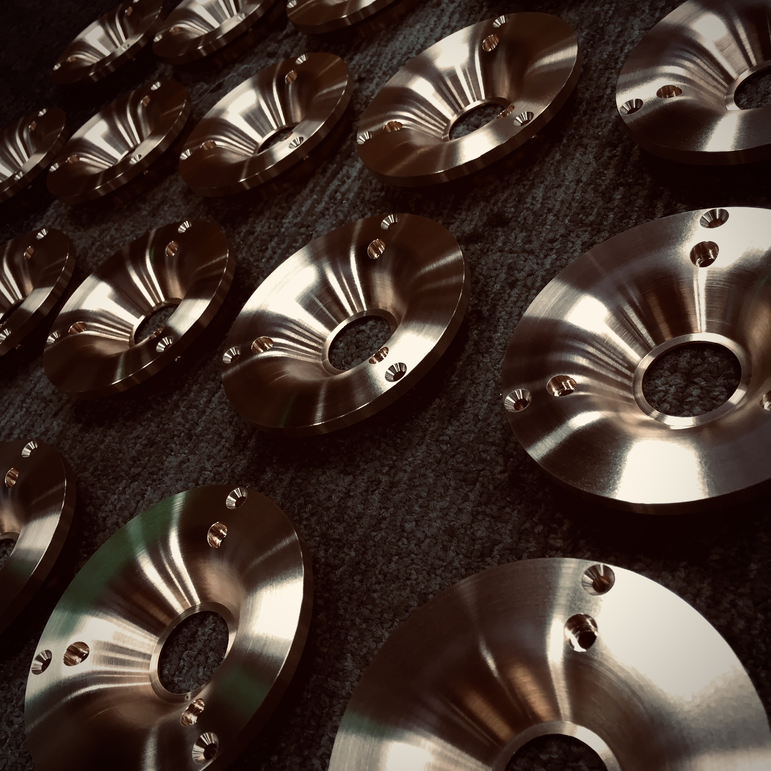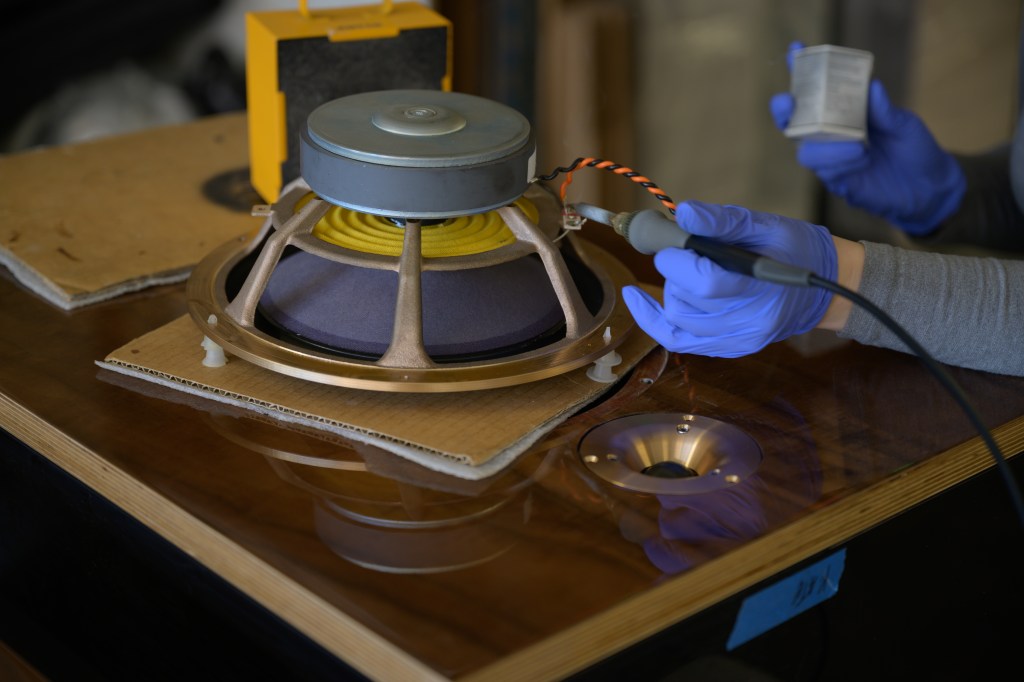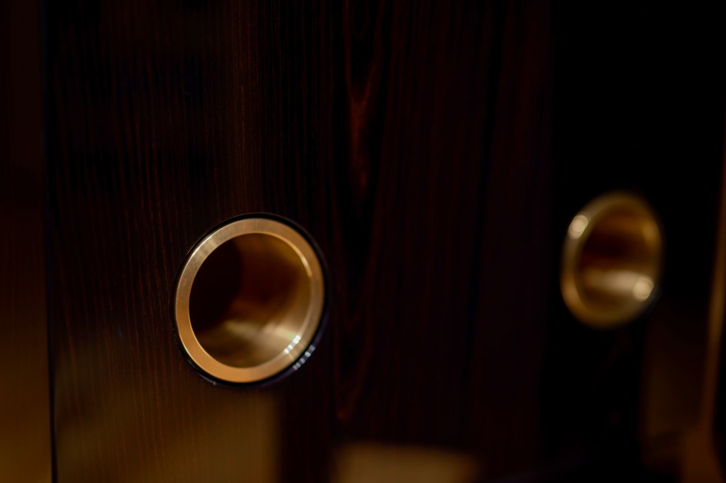 “The woofer uses the same German paper cone as the driver in the O/96, but the linearity of the magnetic gap through which the voice coil moves has been increased significantly by means of a large copper Faraday ring. The ring is mounted directly to the machined bronze phase plug at the centre of the cone to act as a heat sink, drawing heat out of the magnetic gap and decreasing thermal compression. The chassis itself is cast and machined from the same bronze alloy as the tweeter, further increasing stability and decreasing resonance compared with the cast zinc chassis used for the O/96 woofer. The rear ports are also cast and machined from the same bronze; they are mounted, as in the O/Reference, isolated from the cabinet to minimise the effect of vibrations on performance.”