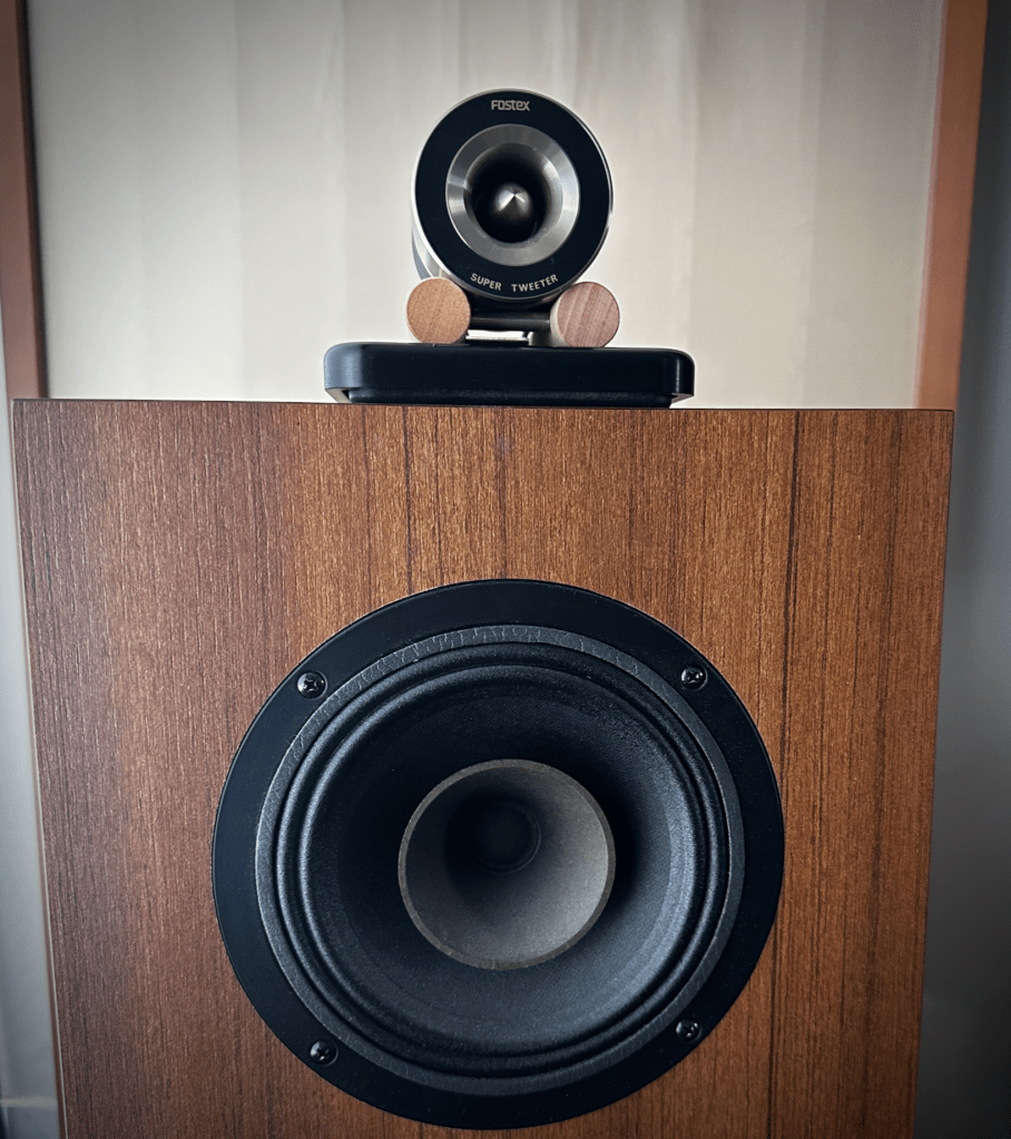 To change things up now and then I have a pair of Omega Super 7XRS mk2 fullrange single driver speakers. These little speakers do some surprising things, and look pretty cool as well. I use these with a pair of Fostex T-90A supertweeters which have been fun to play with. I made the little crossover box with a Fostex L-pad attenuator and a Jantzen Superior capacitor. They work really well.